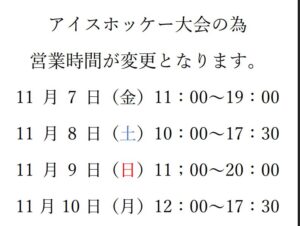 アイスホッケー大会の為、営業時間が変更となります。 11 月 7 日(金)11:00~19:0011 月 8 日(土)10:00~17:3011 月 9 日(日)11;00~20:0011 月 10 日(月)12:00~ […]