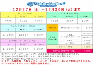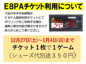 下記の年末年始期間中、E8PA施設利用チケットにてボウリングをご利用する場合、通常と案内内容が異なりますのであらかじめご了承ください。12月27日(土)~1月4日(日)まで チケット1枚で1ゲーム (シューズ代別途35 […]