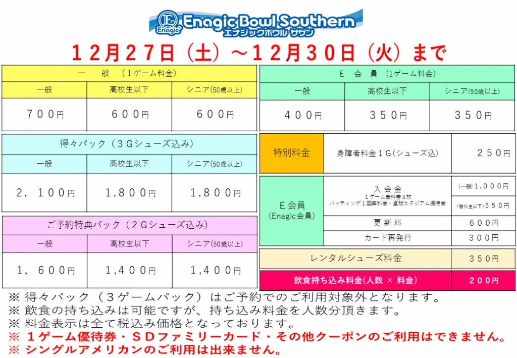 エナジックボウルサザン 年末年始の利用料金について