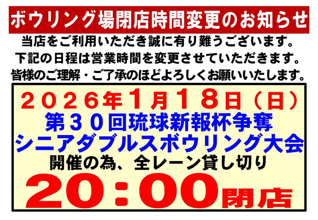 1月18日全レーン貸し切り・閉店時間変更のお知らせ